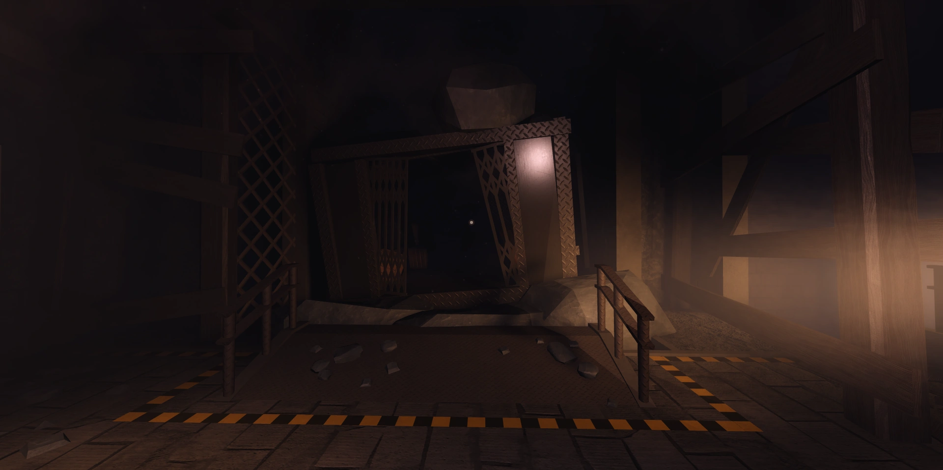 This is the elevator that was used in the Hotel at Room 100 and has crashed down to The Adit. It appears as a mining elevator with wooden boxes and a mining light in them.